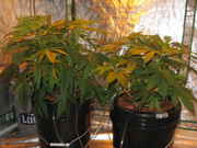 I flushed both plants with pH 6.0 RO water and then mixed up a new nutrient solution. I cut Flora Gro out of the solution in both plants and switched from Beastie Bloomz to Cha Ching. Using a little bit more Flora Micro and Bloom, and also using CaliMagic for both plants. I'm keeping it at pH 5.8 and EC 1.7. Both plants are sucking up nutrients pretty quick. The Doctor is definitely starting to smell good. Very citrusy and fruity. The TNT Kush is somewhat piney and peppery. I'm sure the smell will become much more apparent in the next week.