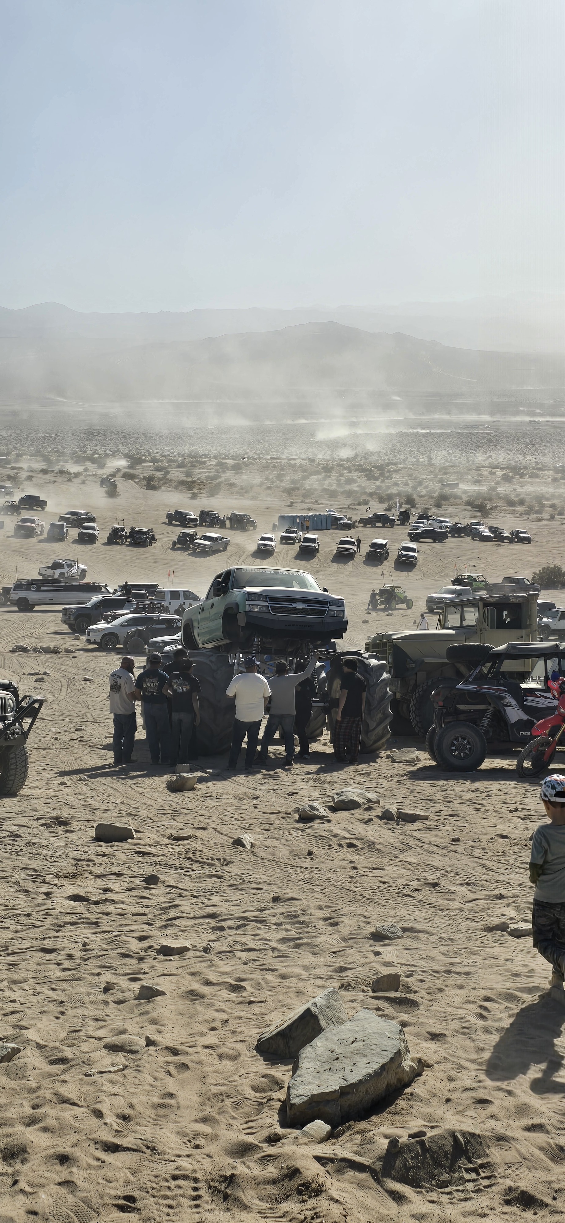 Spent a few days at KOH (King of the Hammers) this weekend. It's an off road event lasting 3 weeks in Mojave Desert, Johnson Valley, CA. With the main big race the last Saturday. It's one of the gnarliest races in off roading. Out of 80 contenders only 4 made it across the finish line. A lot of different stuff happening in between It's pretty fun place to be if you're into the off roading scene. Was able to grab this whole picture of the monster lift on this Chevy Silverado.